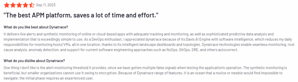 Dynatrace has an average user rating of 4.5 out of 5 stars based on 1,248 reviews on G2.