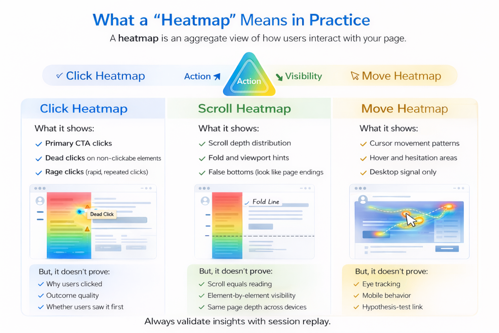 A heatmap is an aggregate visualization of user interaction on a page or screen. It helps you answer questions like: where users try to act, what content is actually seen, and what areas might pull attention (cautiously for move maps). The key is to match the map to the kind of evidence you need: action, visibility, or attention proxy.
