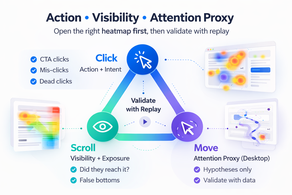A reliable workflow is: Click (action), then Scroll (visibility), then Move (attention proxy), and finally Replay (ground truth). Pairing heatmaps with session replay is where teams stop guessing and start confirming: Session Replay.