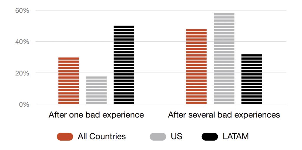 Another survey by PWC indicated that 73% of all people consider customer experience when making purchase decisions. More than half (59%) of US respondents said they would ignore a brand after several bad experiences. One bad experience is enough for 17% of the clients to walk away permanently.