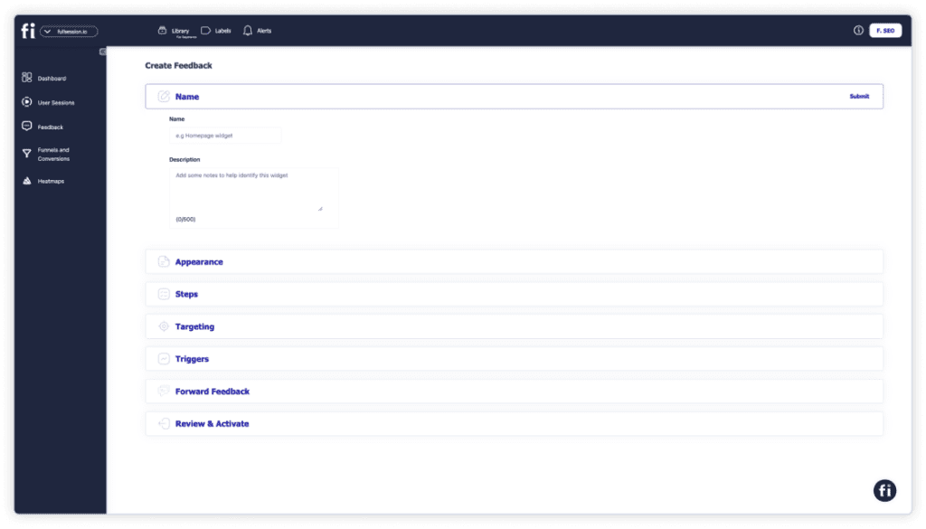 FullSession offers two main ways to collect feedback from your website visitors. The first one is the website feedback form. It allows you to ask directly how your customers feel while browsing, offers real-time feedback collection, and is easy to create from your FullSession account.