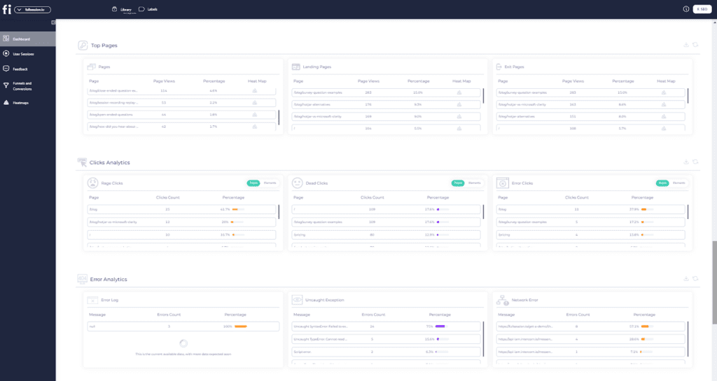FullSession error analysis helps identify, analyze, and resolve errors impacting user experience by leveraging data on error clicks, network errors, console errors, error logs, and uncaught exceptions.