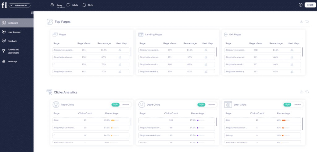 FullSession offers web analytics features that provide comprehensive insights into your site’s overall performance, including areas where visitors experience issues and drop off the marketing or sales funnel.