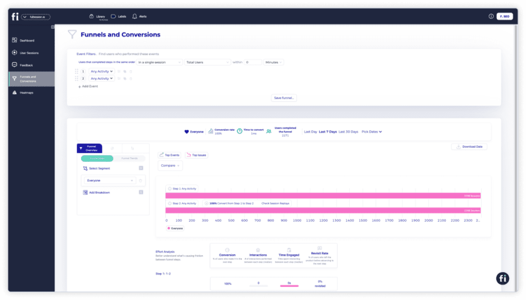 The FullSession funnels and conversions feature offers a detailed analysis of user journeys, allowing you to track and optimize each step of your conversion funnel. Once you visualize user progression and identify drop-off points, you can pinpoint areas needing improvement.