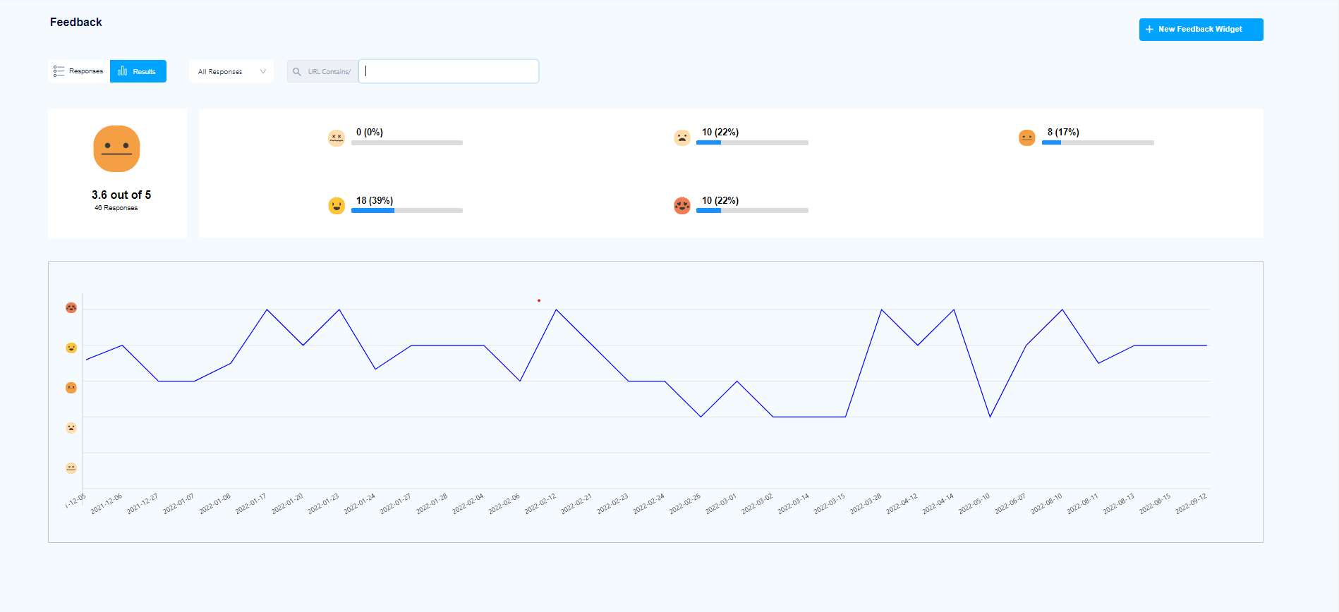 FullSession also has a Results tab which allows you to get a broader overview of customer feedback for a specific period. You can see the results, which summarize the number of users and their overall experience with your website, web app, or landing page. Below is a graph that shows how feedback changes over time.