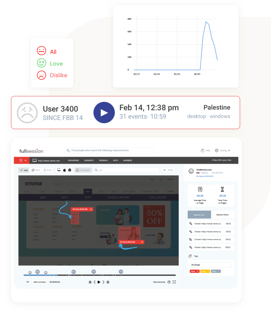 FullSession, our product analytics platform, helps you optimize your sales and marketing funnel. You can also track user actions using session recording tools and analyzing interactive heatmaps.