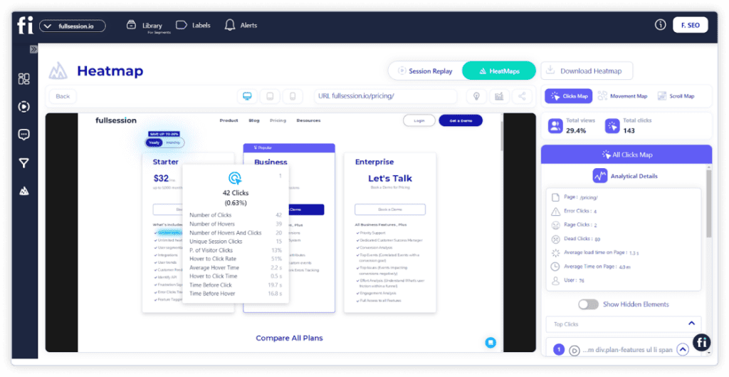 FullSession is an advanced user behavior analytics software that captures all user interactions and gives accurate visual insights to help you improve your website, web app or landing page performance. Key features include session recordings and replays, website heatmap tools, website feedback forms and reports, conversion funnel analysis and error tracking. FullSession is GDPR, CCPA and PCI compliant, making your data private and secure. Pricing starts at $39/monthwith a 20% discount for annual plans, so it’s suitable for all business sizes. Book a demo now.
