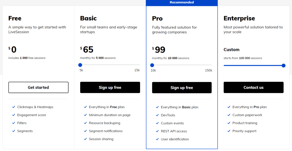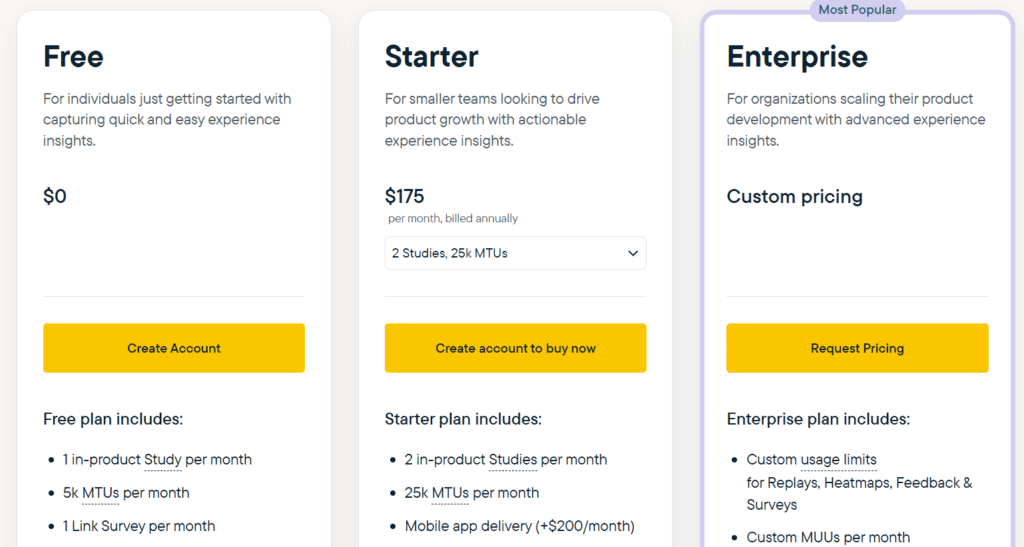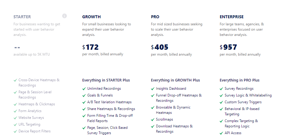Paid plans have advanced features like usability testing, session replays and unlimited heatmaps, which suit growing teams and larger businesses.