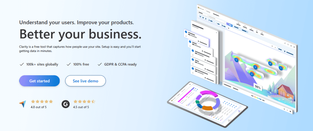 Microsoft Clarity is a free user behavior tool with heat maps, session recordings, and event tracking tools. It records unlimited traffic data but lacks advanced analytics features. Microsoft Clarity is for small to medium-sized businesses looking for a free solution to track user interaction data.