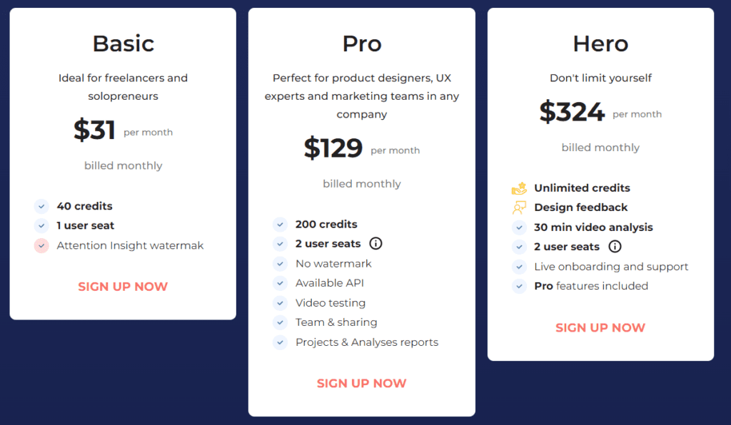Attention Insight is an AI-powered attention prediction tool that helps businesses optimize visual elements on their website. Features include AI-generated heatmaps, visual clarity scoring and design comparison. It integrates with popular design tools like Figma and Sketch, and the pricing starts at $31/month. It’s great for pre-launch testing but only predicts attention and doesn’t have advanced user behavior tracking features.