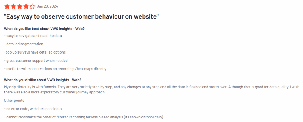 VWO Insights is a user behavior analytics tool that improves website usability through heatmaps, session recordings and funnel tracking. It integrates with various CRMs and has detailed segmentation. Pricing starts at $172/month, which may be higher for small businesses and has a steeper learning curve for beginners.
