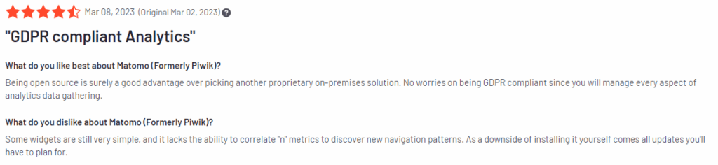 Matomo has an average user rating of 4.2 out of 5 stars, based on 91 reviews on G2.