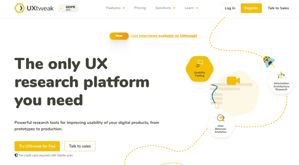 UXtweak is a UX research platform that helps you understand user behavior and improve website usability. It has heatmaps, session replays and usability testing features to give you insights to improve the overall user experience.