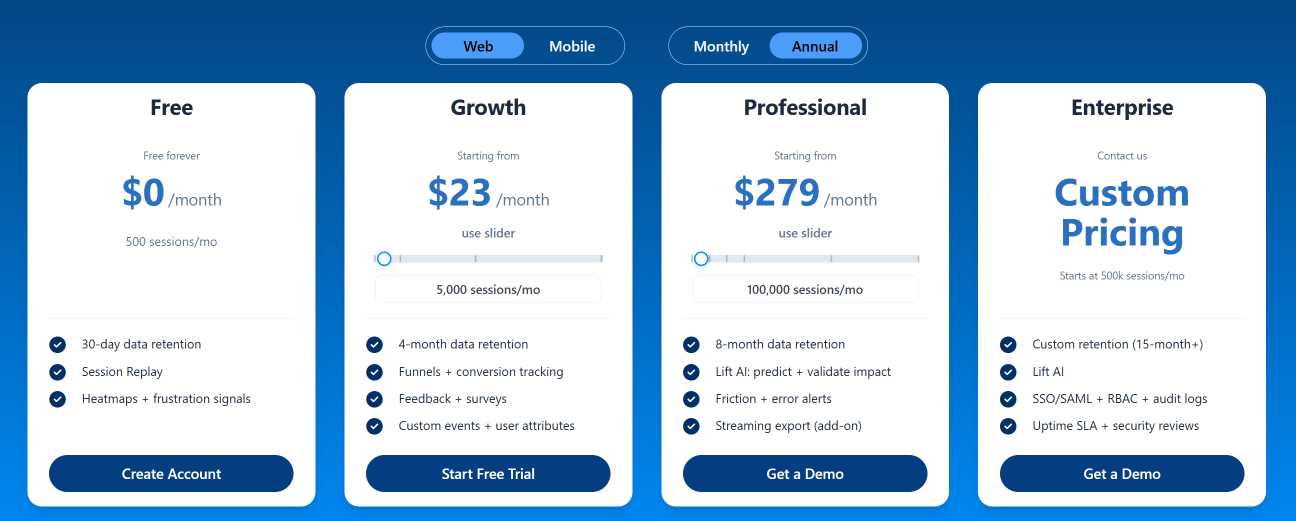 • The Starter plan costs $39/month or $32/year and allows you to monitor up to 5,000 monthly sessions with up to 6 months of data storage.