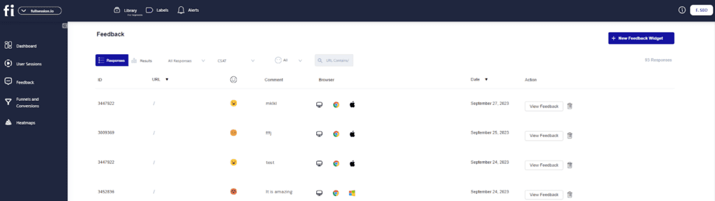 You can also use our customer feedback report to analyze customer feedback and assess response details. You can see the user ID, the visited page, sentiment, comment, browser type, feedback date, and details.