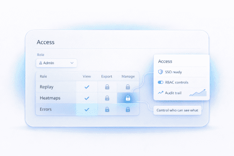 At a minimum, you should look for data masking and blocking controls, encryption in transit and at rest, role-based access, SSO, audit logs, and clear retention and erasure options. FullSession is built around these principles so you can bring it into security-conscious environments.