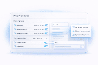 Protect sensitive user data at capture while still seeing the behavior and technical signals your teams need to debug issues and improve journeys.